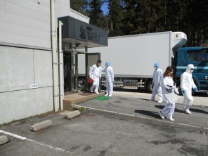 下の写真は避難指示を受け、屋外に避難している時のものです。社員が率先して誘導しています。
