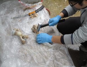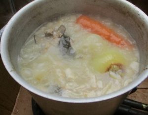 こだわりの豚骨ラーメンはスープを一から作りました。写真は豚骨を砕いている時のものです。その後、野菜と一緒に煮込むことで豚骨ラーメン特有の白いスープの出来上がりです!